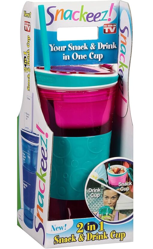na svačinu a nápoj 2 v 1 Snackeez má objem 47 cl, je vybaven integrovanou nádobkou na svačinu o objemu 110 ml, víčkem a brčkem. Produkt je k dispozici ve čtyřech barvách. Můžete zpestřit dětskou oslavu tímto kelímkem na svačinu a nápoj jako malým dárkem. Je také ideální na cesty.
