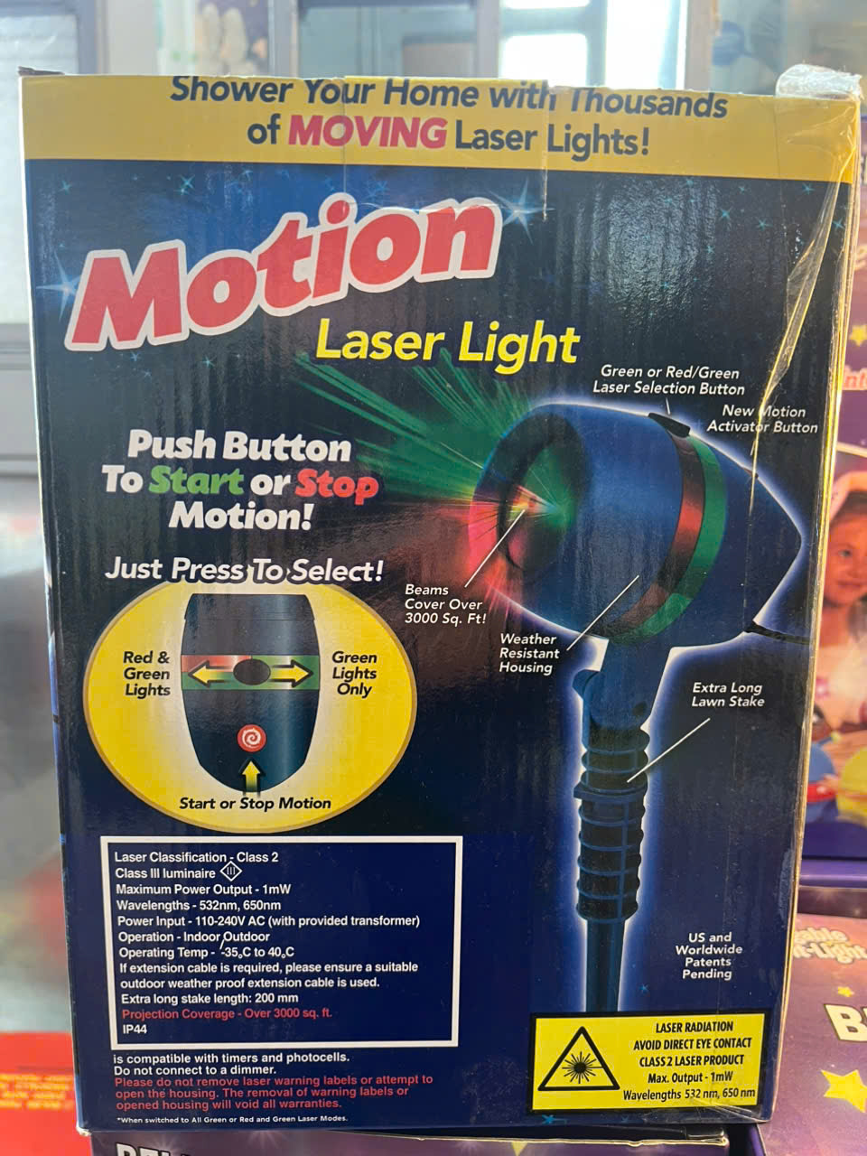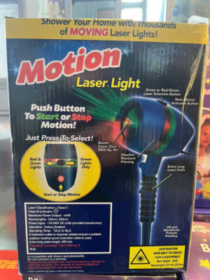 Motion Laser Light je výkonné dekorativní laserové světlo, které dokáže během okamžikuproměnit váš dům nebo zahradu v jedinečnou světelnou show. Zařízení vytváří tisíce pohyblivých laserových efektů a dokáže pokrýt plochu více než 3000 čtverečních stop (cca 280 m²).